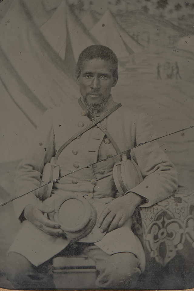 Marlboro Jones, enslaved by Captain Randal F. Jones of the 7th Georgia Cavalry, sat for a formal portrait in a Confederate uniform. According to historynet.com, the canteens indicate his role as a camp slave rather than a fighting man. (Virginia Museum of History and Culture)