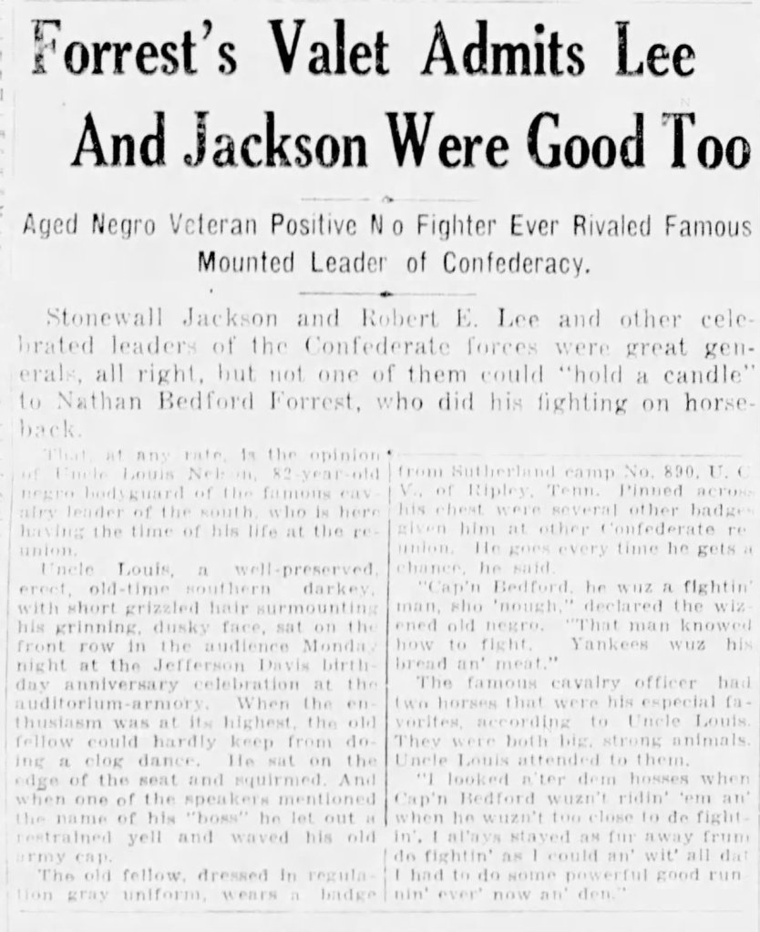 Nelson W. Winbush, a black member of the SCV from Tennessee, told anyone who would listen that his grandfather, “private” Louis Napoleon Nelson, was a Confederate soldier fighting under Nathan Bedford Forrest, the first national leader of the Ku Klux Klan. Nelson’s pension records actually list him as a “cook” and “servant.”