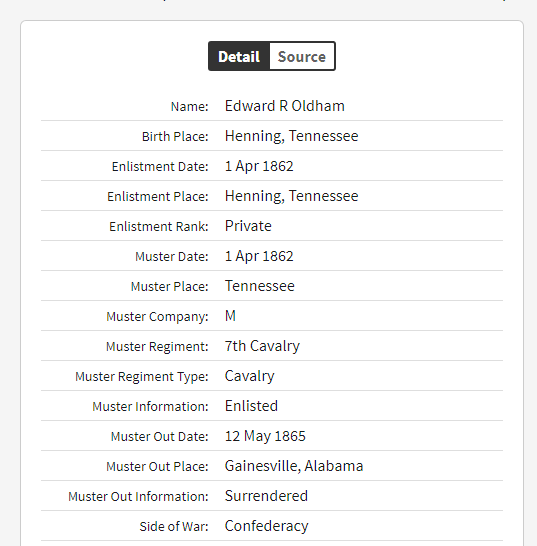In his pension papers it says Nelson was enslaved to James, Sidney, and ER Oldham. His pension also says that he was a servant and a cook. The Confederacy (the thing heritage types are supposed to be honoring) did not consider these jobs as Soldier’s jobs. His widow was denied for pension at least once,