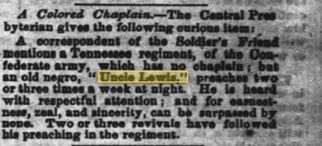 Some sources that are not vetted or reviewed by civil war historians, claim that Louis was the first black chaplain and cite a newspaper article from September 10, 1863, The Religious Herald. That article was syndicated in the The Times-Picayune, The Oskaloosa Independent, and The Essex County Standard in the same year. The article mentions a slave named “Uncle Lewis”. However, the slave described is called “an old negro”.