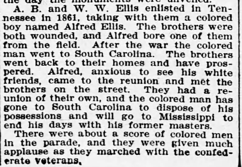 According to the newspaper, Alfred was so happy to have found his former enslavers (W.W. and A.B. Ellis) after 40 years that he agreed to sell all his belongings in North Carolina and move his family to Tennessee with A.B. Ellis.
