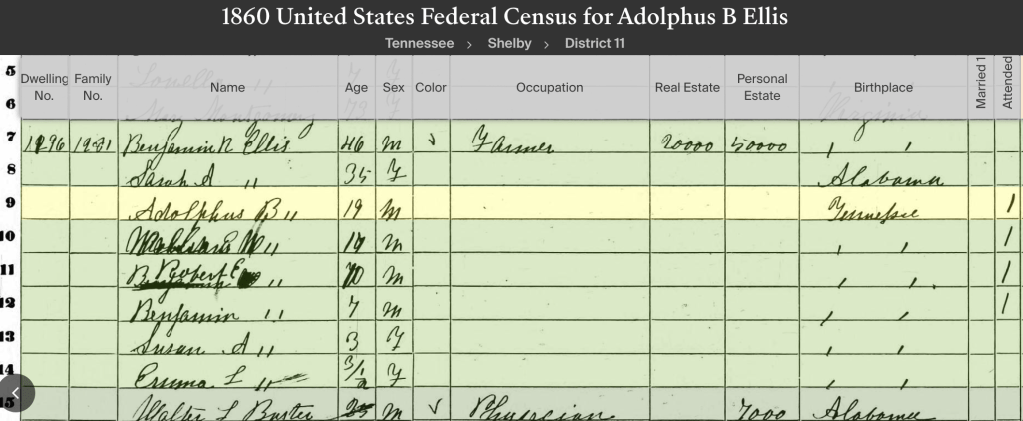 The 1860 Slave Census, shows that their father Benjamin Ellis, enslaved 38 people, including 3 males who were 10, 11, and 13. It’s hard to say which one might be Alfred.