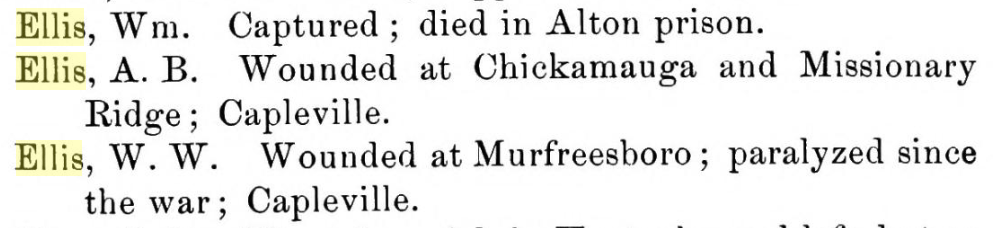 W.W. Ellis, aka William Wallace Ellis, would have been around 17 or 18. A.B., aka Adolphus B. Ellis, was 19 years old based on 1860 census records. He was 20 when he mustered into Company C in 1861. Because the census taker scribbled over W.W.’s name, I had to check the 1850 Census to be sure it was him.